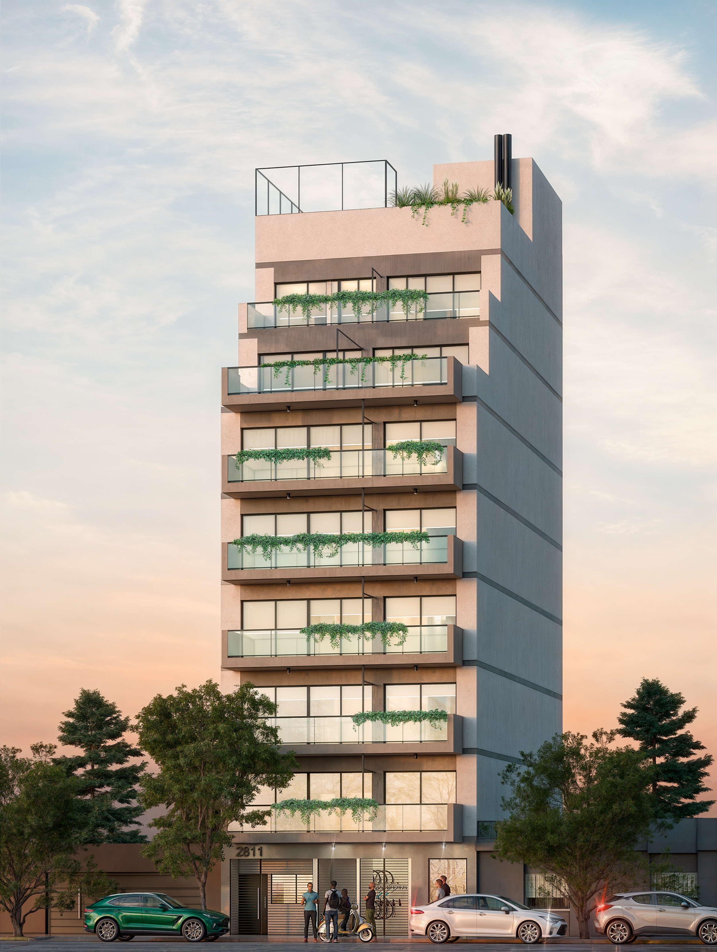 Se trata de un diseño moderno, basado en los cambios de necesidades que ocurrieron tras la pandemia, con unidades pequeñas con prestaciones que atraen a un público cada vez más exigente, y que cuenta con espacio de coworking, de guardado de motos y bicicletas, con una pileta de natación de 10.000 litros rodeado de césped y deck de madera, parrilla , mesas y sillas en un espacio de esparcimiento en el 8° piso , con una vista abierta a la ciudad.